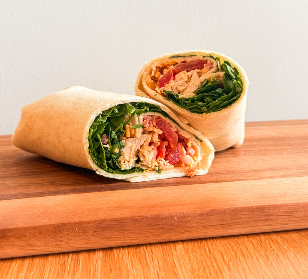 Tortilla, effiloché de filet de poulet VF, mayonnaise, sauce barbecue, poitrine grillée, cheddar, oignons frits, tomates, laitue