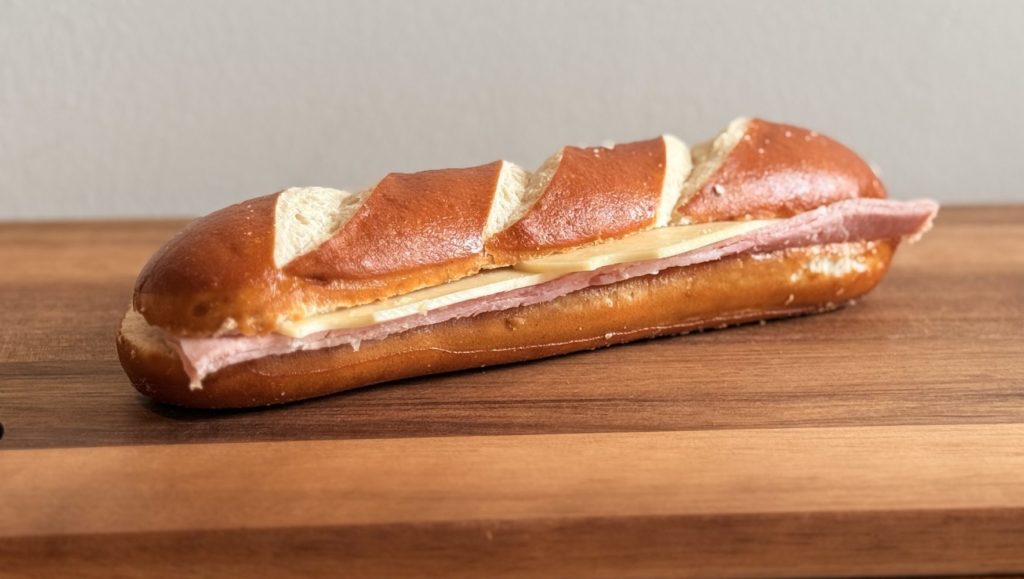 Pain bretzel, mayonnaise, jambon, emmental