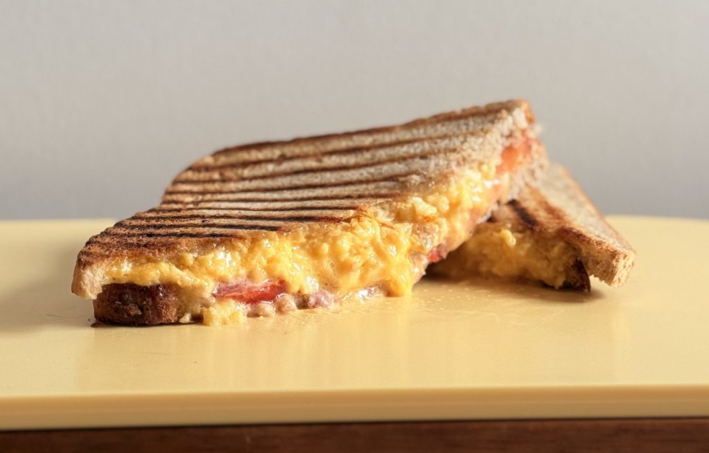 Pain de mie BIO, oeuf brouillé maison, tomates BIO, lardons, cheddar, mayonnaise