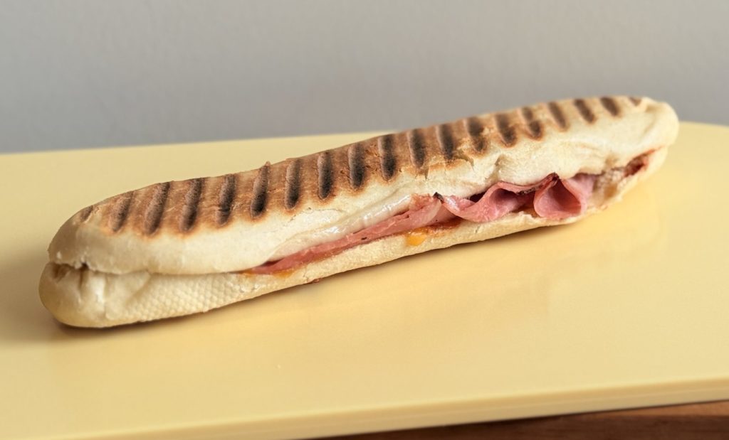 Panini, jambon blanc, sauce tomate BIO, tranches de mozzarella, tranches de cheddar
