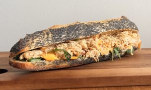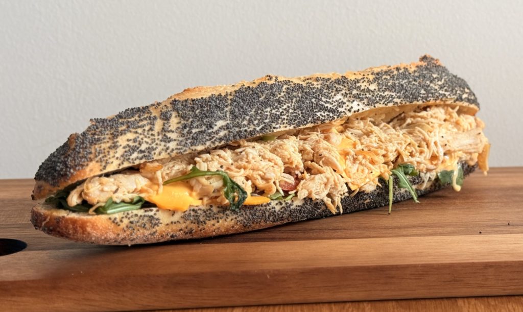Baguette pavot Label Rouge, effiloché de filet de poulet VF, tomates BIO, roquette, cheddar, mayonnaise