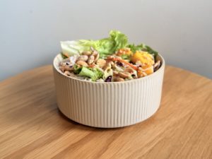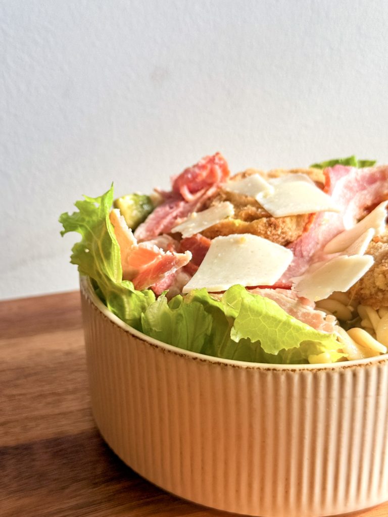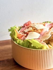 Batavia, salade romaine, fusilli BIO, tenders de poulet maison (poulet VF, chapelure, farine, œuf), poitrine fumée, roquette, tomate BIO, avocat, Grana Padano AOP, sauce caesar (anchois, Grana Padano AOP, huile d’olive, mayonnaise, jus de citron)