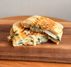 Maxi pain panini, fromage de chèvre, épinards, champignons blancs, farine de blé BIO, crème fraîche, mozzarella