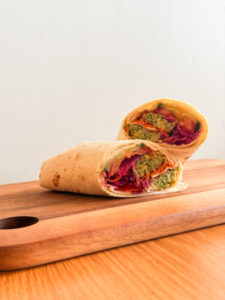 Tortilla, falafels, carottes BIO, houmous de pois chiche, tomates cerises confites, batavia, pickles de chou rouge