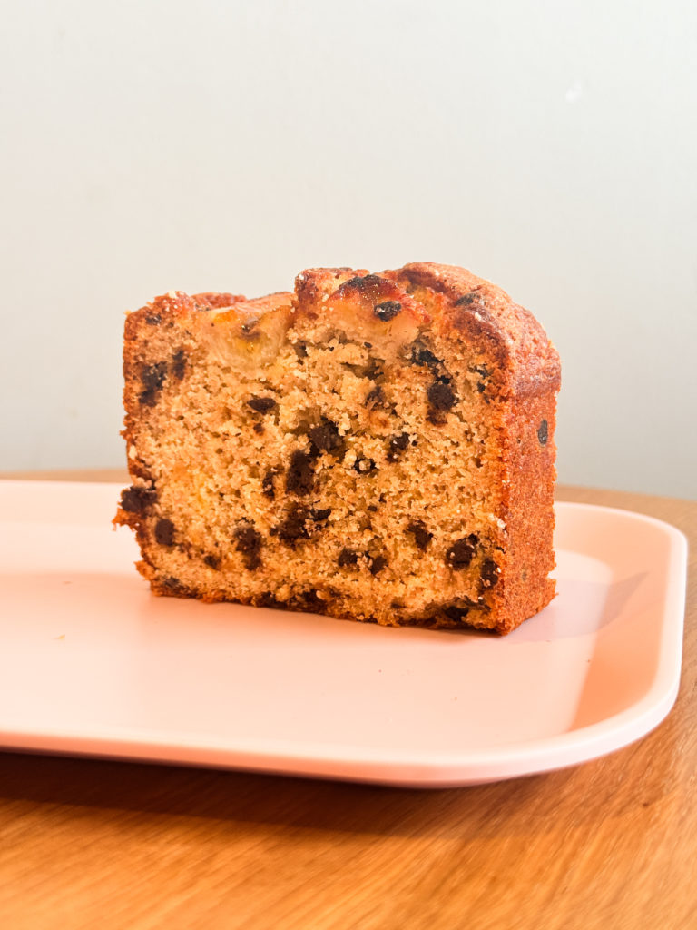 Banane, farine de blé BIO, poudre d’amande, pépites de chocolat, sucre cassonade, beurre demi-sel, oeuf entier, levure