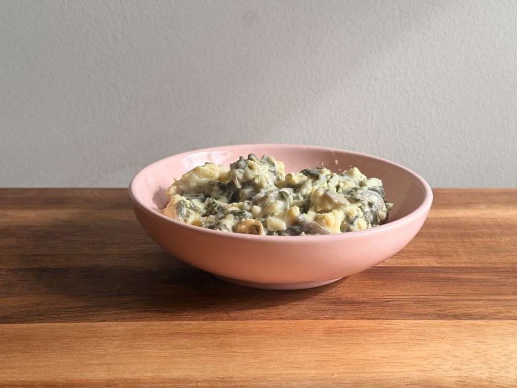 Oeuf brouillé (oeuf entier, beurre), épinards, champignons, crème fraiche épaisse, mozzarella, farine