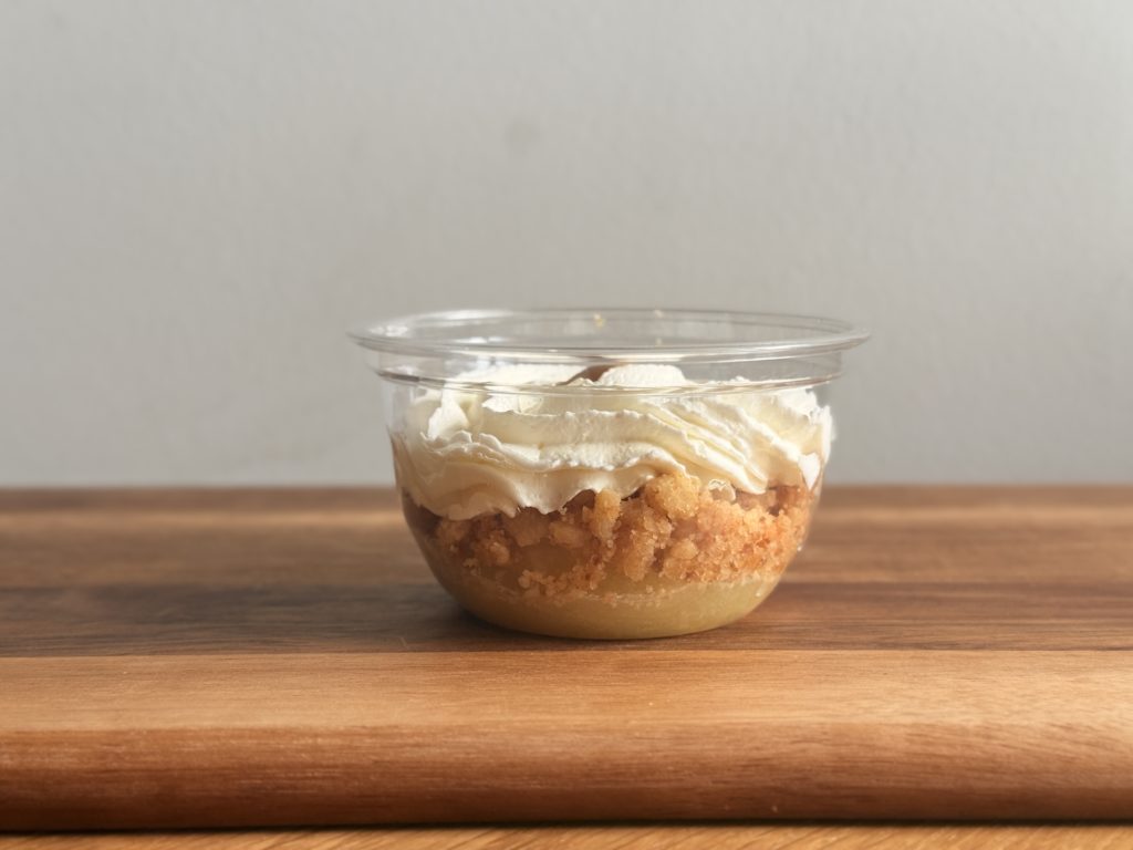 Pommes, crumble (farine de blé BIO, sucre semoule, beurre doux), caramel, chantilly (crème, sucre glace, vanille), sucre cassonade