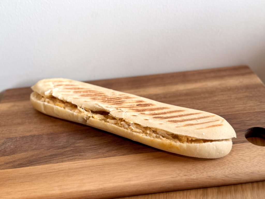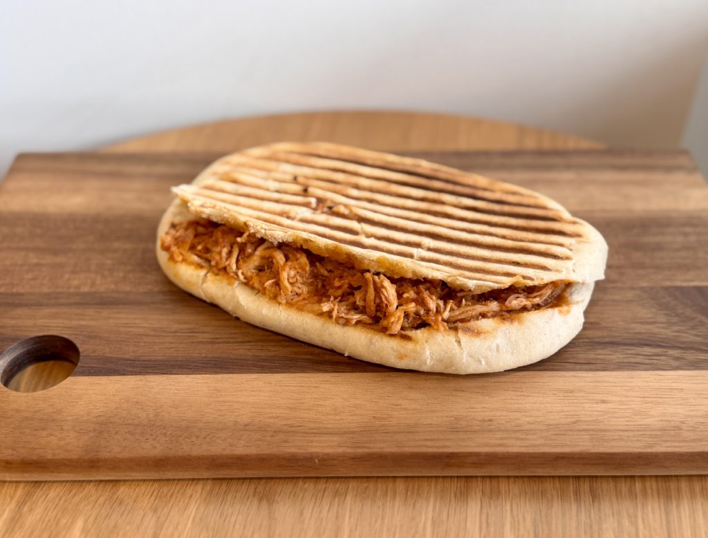 Panini, crème fraîche, cheddar, effiloché de poulet, mozzarella, épices