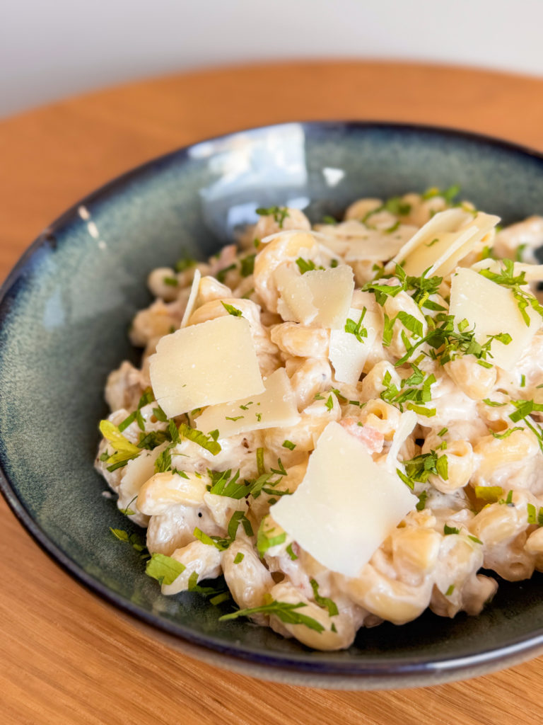 Cellentani, crème, lardons fumés, oignons, persil, pecorino vieux, jaune d’oeuf