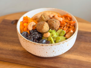 Riz vinaigré, falafels, potimarron BIO, carottes BIO, houmous maison, olives noires, fèves, tomates cerises confites, cumin