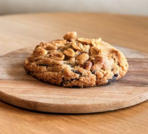 Chocolat noir, éclat de caramel, beurre, farine de blé BIO, oeuf eniter, sucre cassonade, sucre semoule, levure