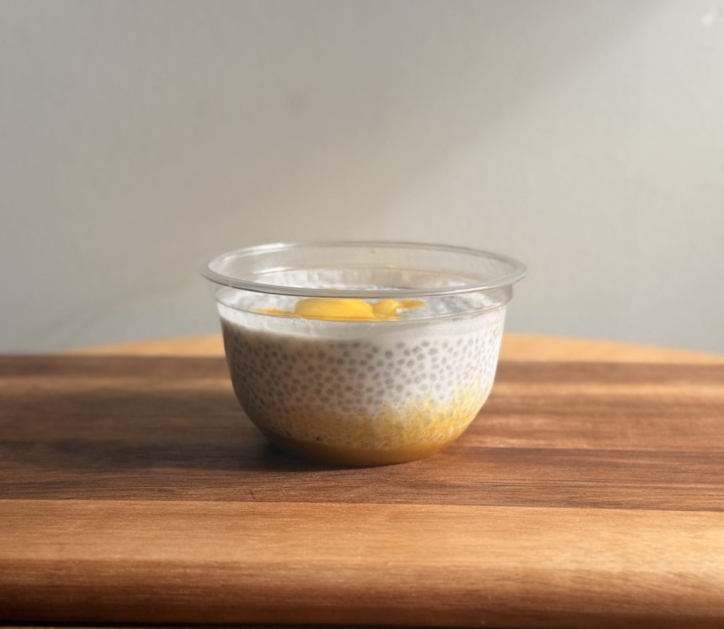 Lait de coco, graines de chia BIO, mangue & coulis de fruits exotiques
