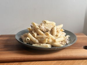 Penne, crème, champignons blancs, oignons, poulet, moutarde de dijon, moutarde à l’ancienne