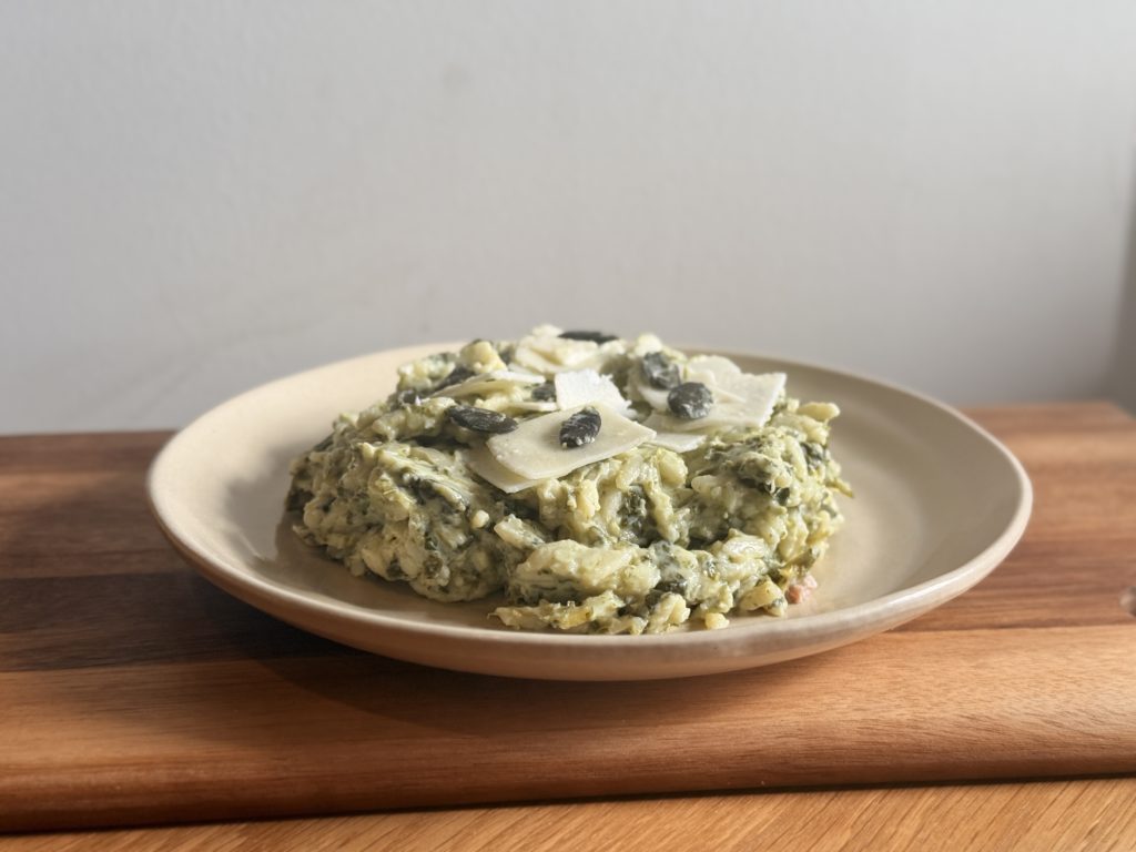 Risetti, crème fraîche, épinards, poireaux BIO, oignons rosés, mascarpone, vin blanc, fromage italien, graines de courges, citron confit