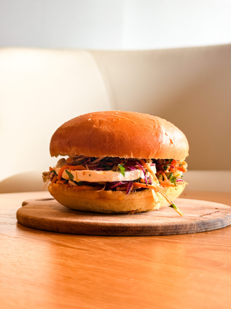 Pain brioché, coleslaw, fromage de chèvre, sauce chimichurri (herbes de provence, ail, coriandre, piment de cayenne, huile de tournesol, vinaigre blanc)