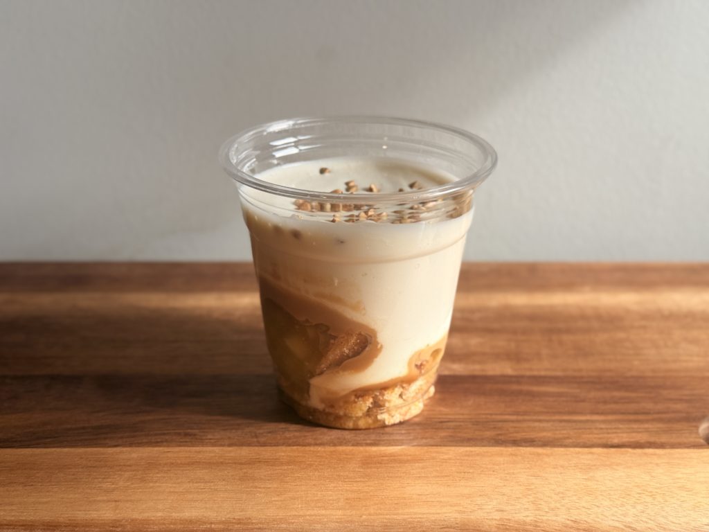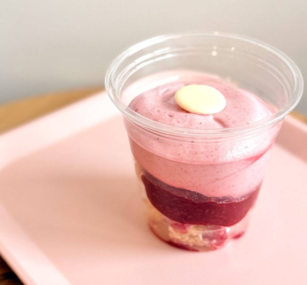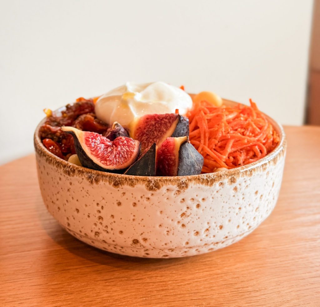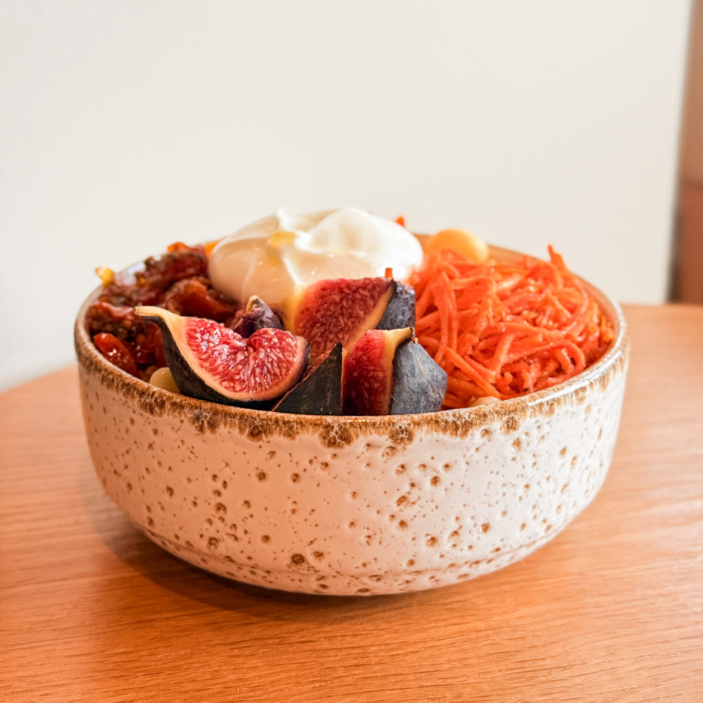 Granola (amande, baie de Goji, huile de tournsol, miel, noix, flocon d’avoine), crème cacahuètes (pâte arachides, yaourt grec, miel), mousse fromage blanc (fromage blanc 0%, blanc ‘doeuf, extrait de vanille, jus de citron, sucre semoule)