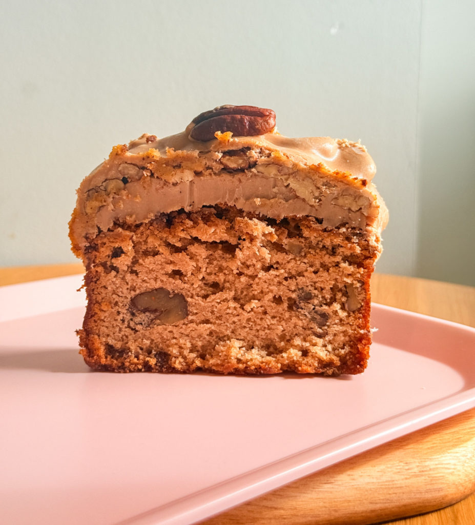 Sucre cassonade, farine BIO, crème, beurre, praliné pécan, noix de pécan, oeufs, chocolat blanc, levure, sel