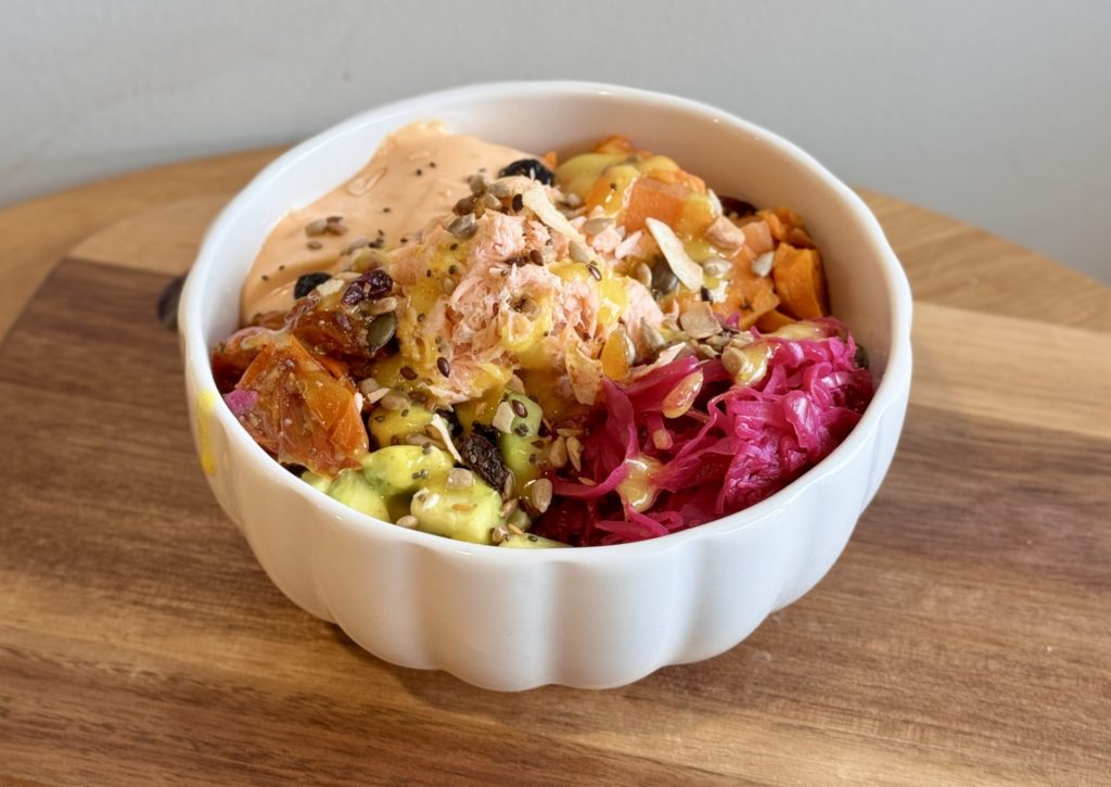 Riz vinaigré, filet de saumon, patates douces, mayonnaise sriracha, tomates cerises confites, avocat, pickles de choux rouge